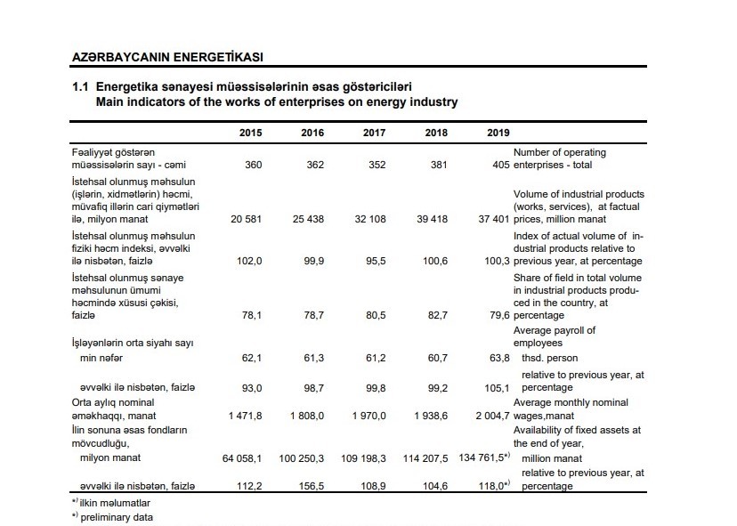 Main macroeconomic by sector of energy and energy efficiency indicators 1.1 Main indicators of the works of enterprises on energy industry